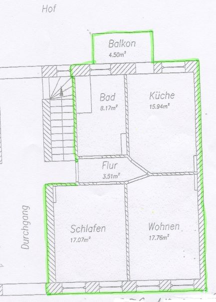 Es sind 3 Räume (ein Durchgangszimmer) vorhanden, eine offene Küche, ein Abstellraum und ein Bad mit Dusche. Die Fußböden sind mit einem PVC-, einem Teppich- sowohl Fliesenbelag ausgestattet.